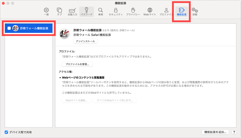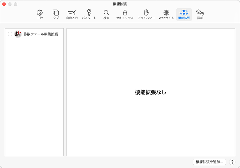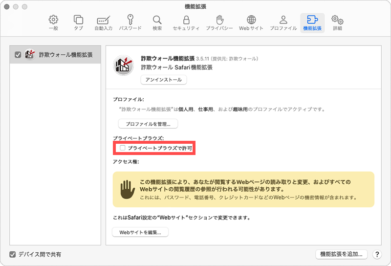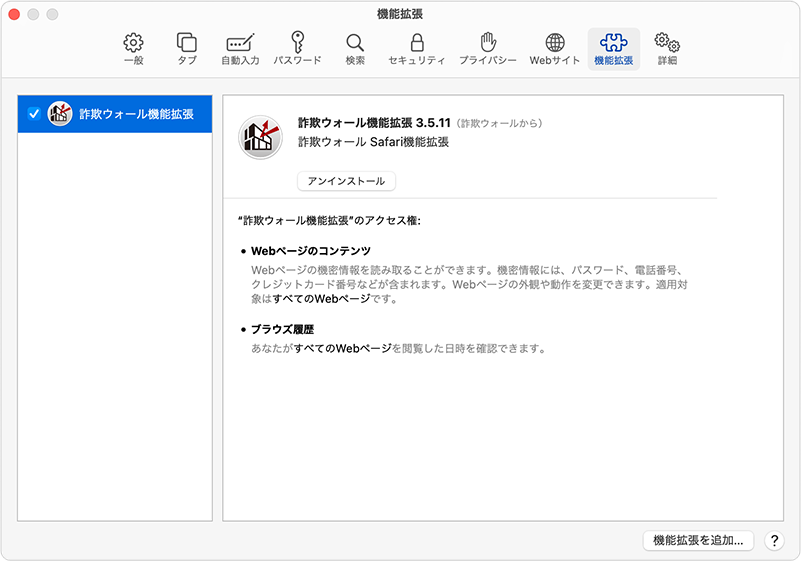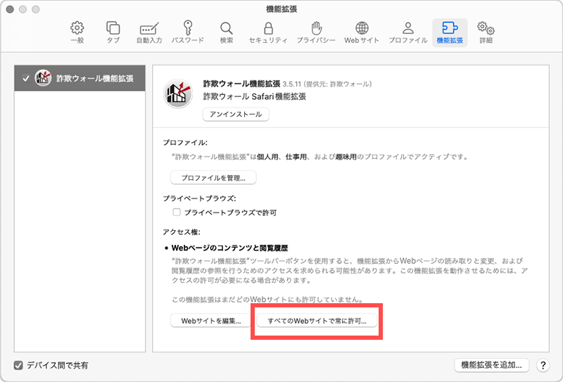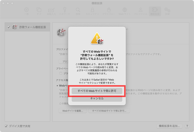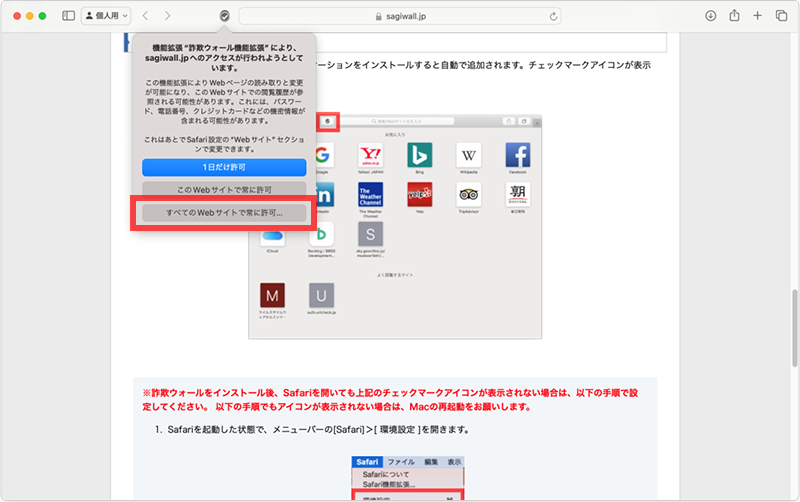 ■ macOS 14 SonomaおよびSafari 17以上で、詐欺ウォール拡張機能アイコンに⚠マークが表示される場合は、追加の設定が必要です。以下手順にて設定してください。
