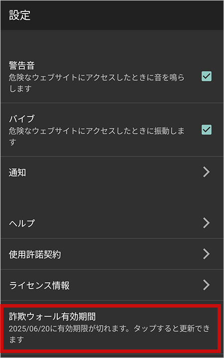 「ライセンスの更新」はご利用中の詐欺ウォールアプリの、有効期限切れ通知からもお手続き可能です。