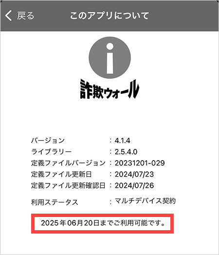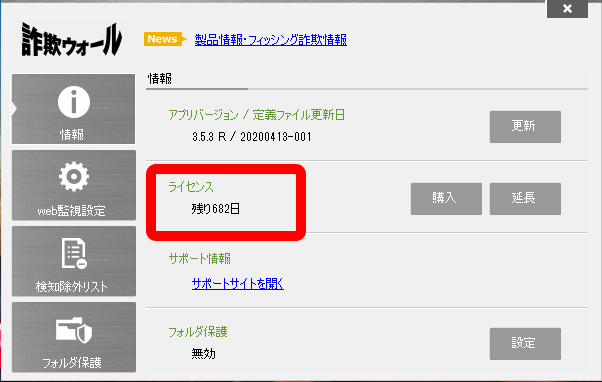 詐欺ウォールの「ライセンスの更新」が、以下よりお申し込み可能です。(パッケージ版・ダウンロード版・ワイモバイル版 など) お申し込み完了メールに記載された「更新ライセンス」を、アプリへ再度入力することで更新が完了します。