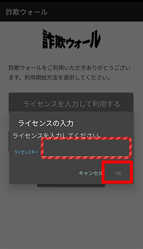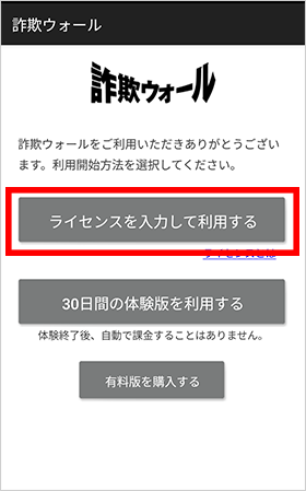 ※ライセンスとは、詐欺ウォールをご購入/契約いただいた際に提供される詐欺ウォールを有効化するための10桁もしくは13桁の英数字です。